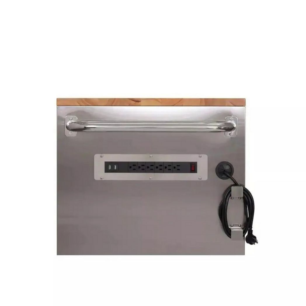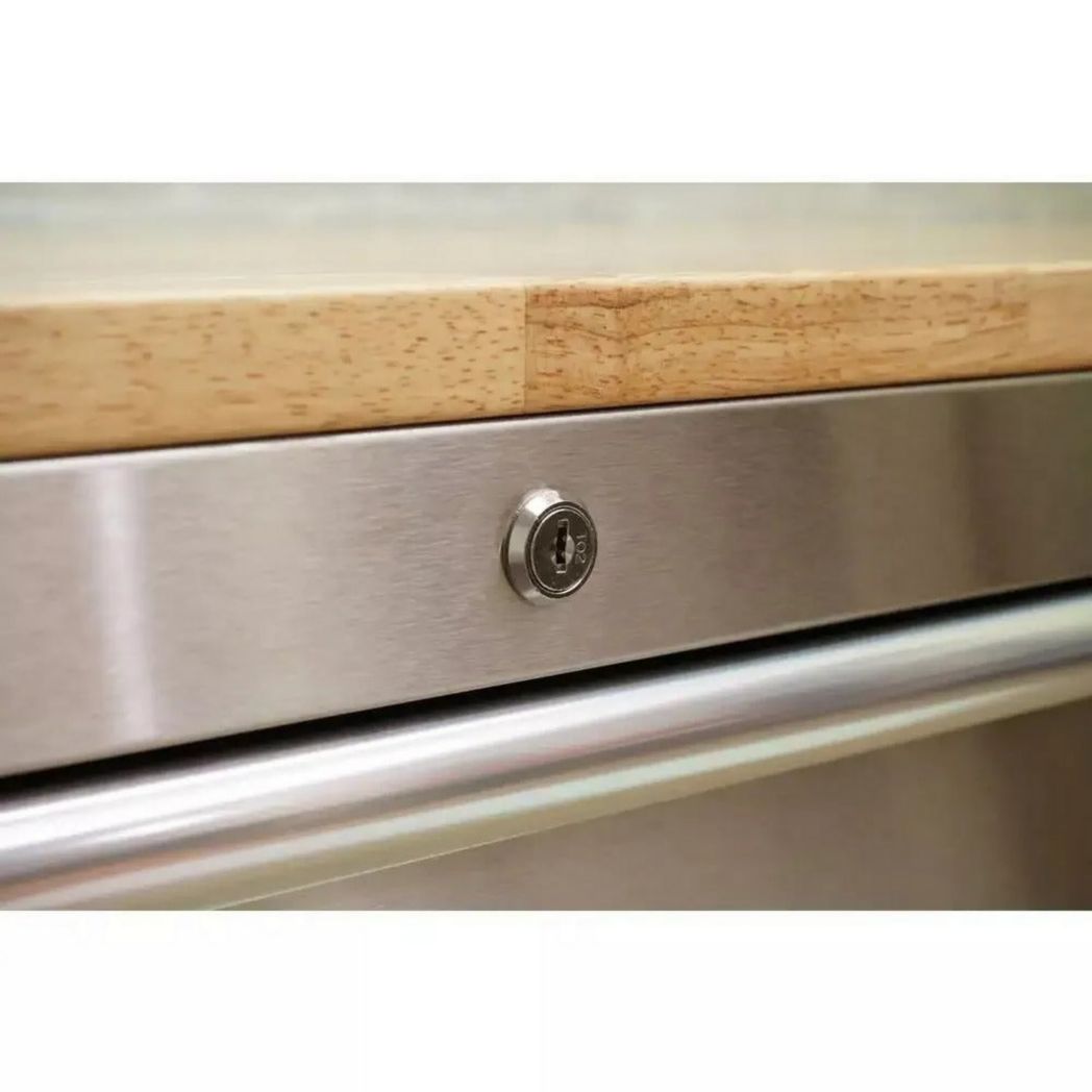 L'établi mobile de 72 po à 18 tiroirs en acier inoxydable est une armoire à outils qui allie parfaitement capacité de rangement et surface de travail fonctionnelle pour les passionnés d'outils. Il est construit en acier robuste de calibre 21. Cet établi mesure 24 po de profondeur, soit 6 po de profondeur que la plupart des armoires à outils roulantes standard, offrant un espace de rangement plus utile et suffisamment solide pour supporter 1 800 lb (827 kg) avec une capacité de 33 545 po³ (84 740 kg). Le dessus en bois massif de 1 po d'épaisseur est recouvert d'un revêtement protecteur en polyuréthane pour le protéger des intempéries. Le poste de travail est équipé d'un bloc d'alimentation avec 6 prises et 2 ports USB. Des revêtements de tiroir de qualité supérieure sont inclus pour empêcher les outils de bouger. Chaque tiroir est équipé de glissières à roulement à billes à fermeture douce d'une capacité de 100 lb (45 kg). Le tiroir supérieur long et les trois tiroirs inférieurs sont équipés de doubles glissières à fermeture amortie d'une capacité de charge de 45 kg (100 lb) pour une capacité de charge accrue jusqu'à 90 kg (200 lb), ce qui permet de ranger des articles plus lourds et encombrants. Ce poste de travail mobile est équipé de six roulettes pivotantes de 12,7 cm x 5,1 cm (5 po x 2 po) et d'une poignée latérale tubulaire en acier, facilitant les déplacements, même à pleine charge. Le centre de travail mobile dispose également d'un système de verrouillage interne à clé, avec 2 clés fournies, pour plus de sécurité.