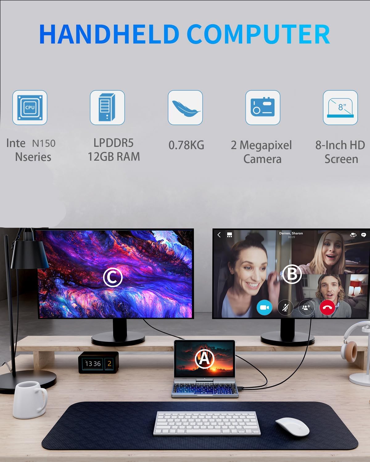 Design ultra compact et portable pour une utilisation en déplacement : ce mini ordinateur portable de 8 pouces est incroyablement compact et léger, pesant seulement 0,78 kg. Parfait pour les étudiants, les professionnels ou les voyageurs. Glissez-le facilement dans votre sac à dos ou même dans une grande poche, ce qui le rend très portable pour un usage quotidien