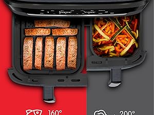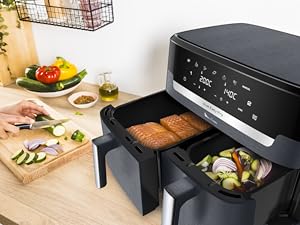 Avec Dual Easy Fry XXL, préparez un repas complet pour toute la famille dans un seul et même appareil! Du poulet dominical accompagné de frites croustillantes au saumon accompagné de légumes fondants, préparez facilement un large éventail de plats sains et savoureux. Grace à la cuisson synchronisée des deux tiroirs mettez les aliments dans votre Easy fry lancer les deux bacs en cuissons et ils se termineront en même temps. Les sept programmes prédéfinis facilitent la cuisson, tandis que le panier compatible lave-vaisselle garantit un nettoyage sans effort.