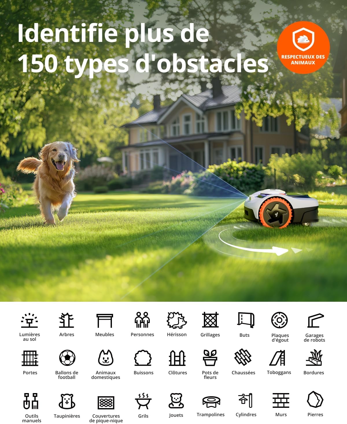 Identifie plus de 150 types d'obstacles: Par rapport aux capteurs à ultrasons ou aux pare-chocs, la caméra à champ de vision de 140° de Navimow tondeuse a gazon avec des algorithmes Al intégrés peut détecter plus de 150 types d'objets courants dans le jardin pour garantir une plus grande capacité d'évitement des obstacles et un niveau de garantie de sécurité plus élevé.